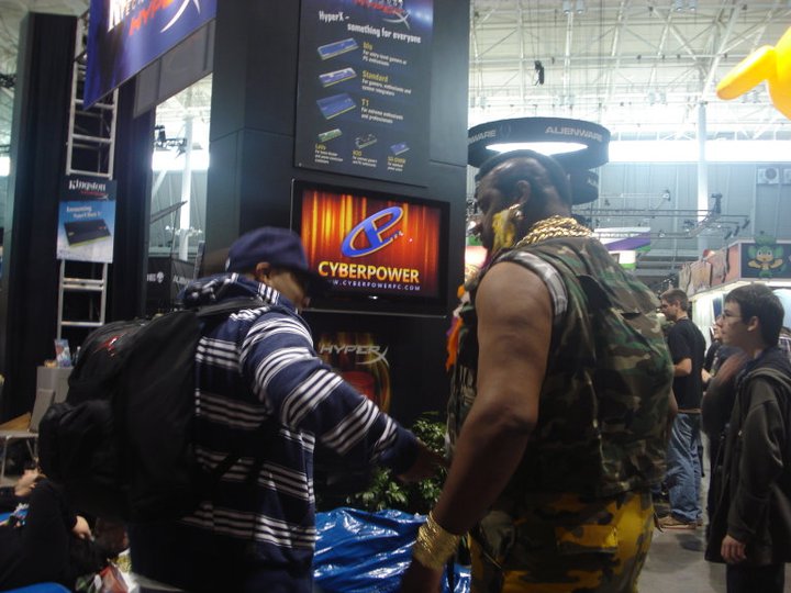 The view from our booth. “Yeah, you can find us behind PokeAss”. Also, Mr. T cosplay. He was awesome.